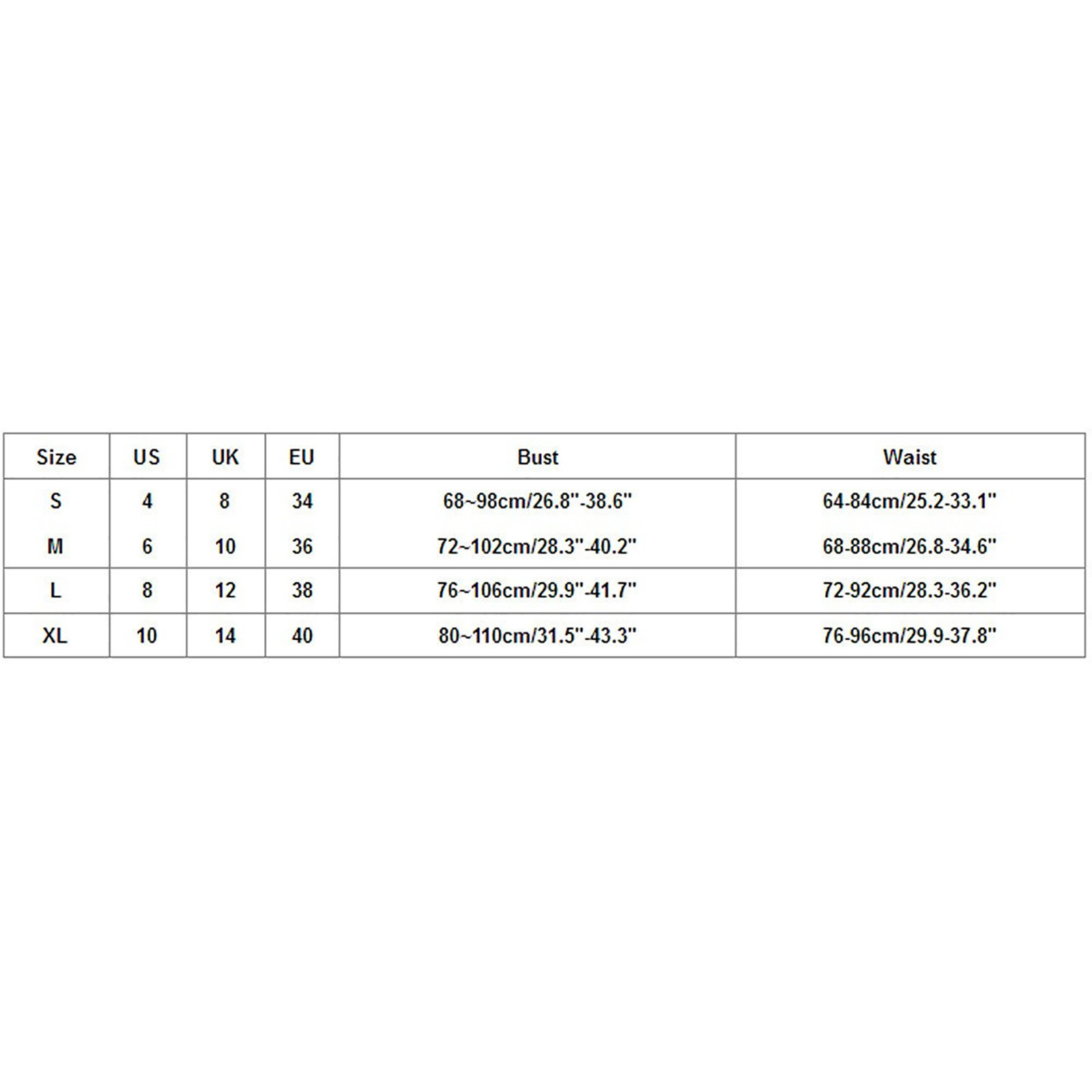 Размер США Великобритания ЕС Бюст Талия S 4. 8 34 68 ~ 98 см/26,8 "-38,6" 64-84 см/25,2-33,1" М 6 10 36 72 ~ 102 см/28,3 "-40,2" 68-88 см/26,8-34,6" L 8 12 38 76 ~ 106 см/29,9 "-41,7" 72-92 см/28,3-36,2" XL 10 14 40 80 ~ 110 см/31,5 "-43,3" 76-96 см/29,9-37,8"