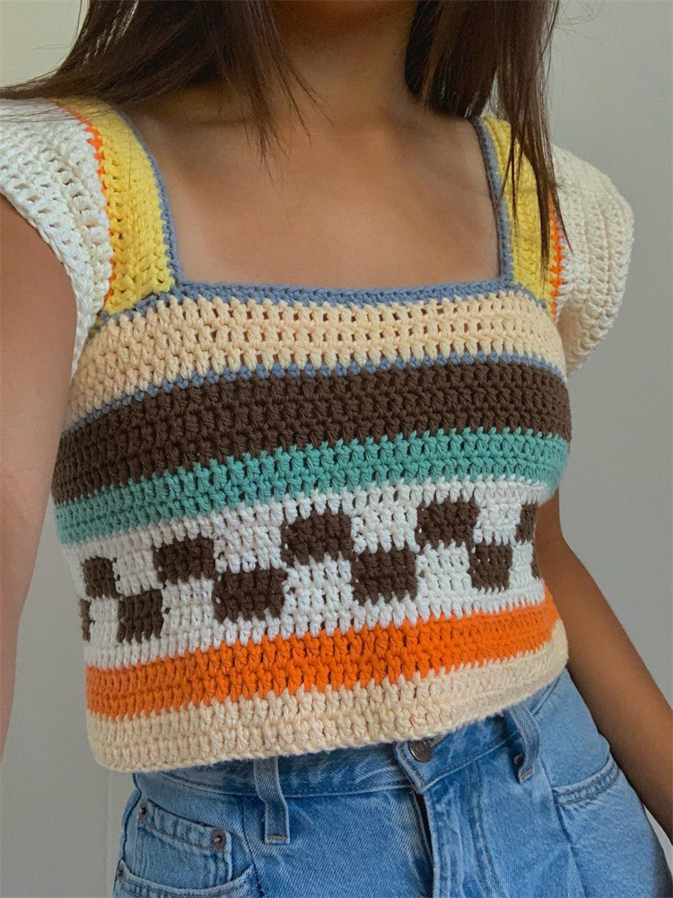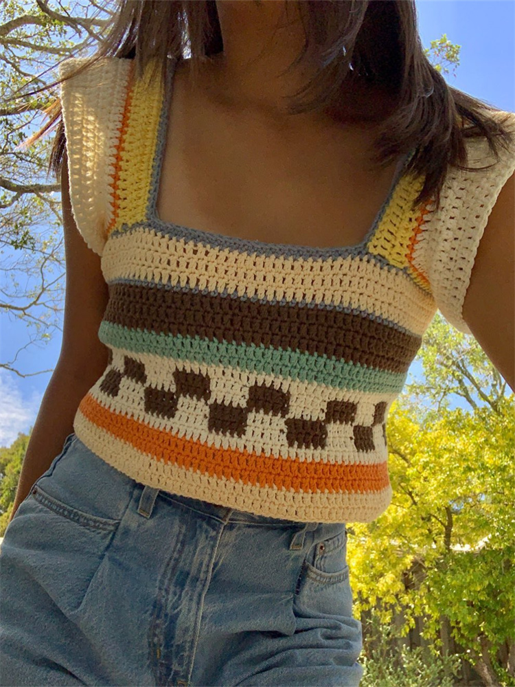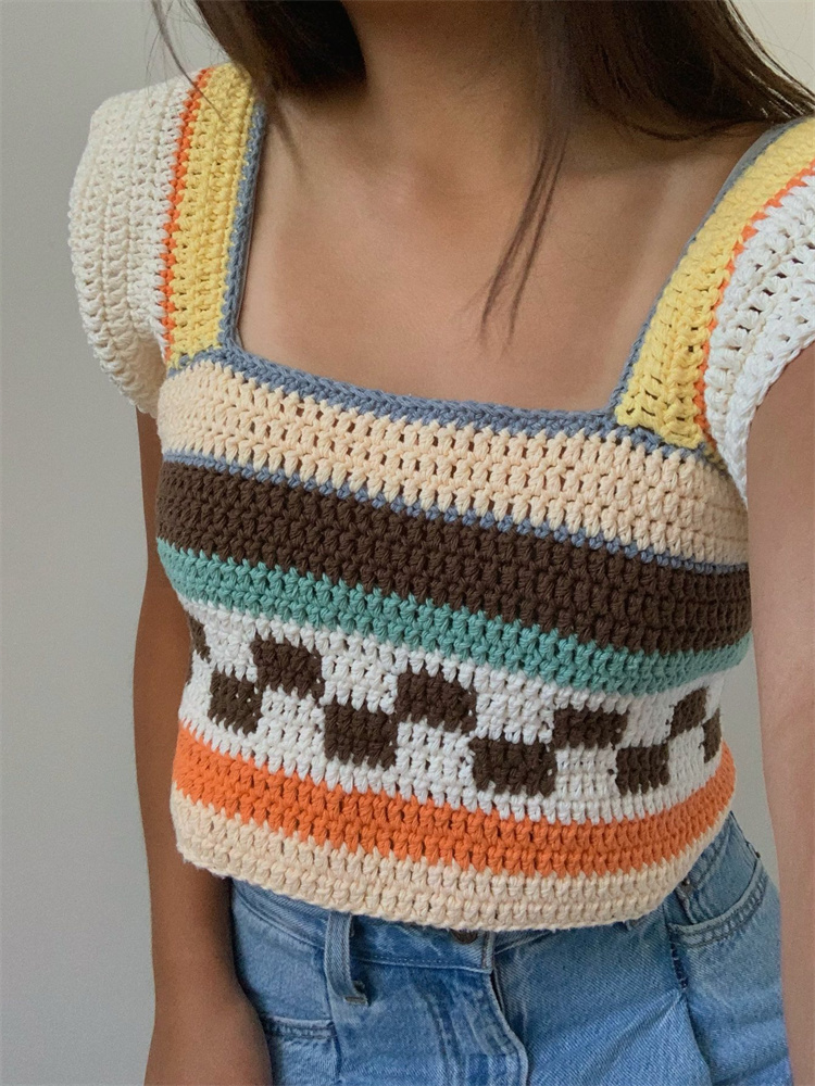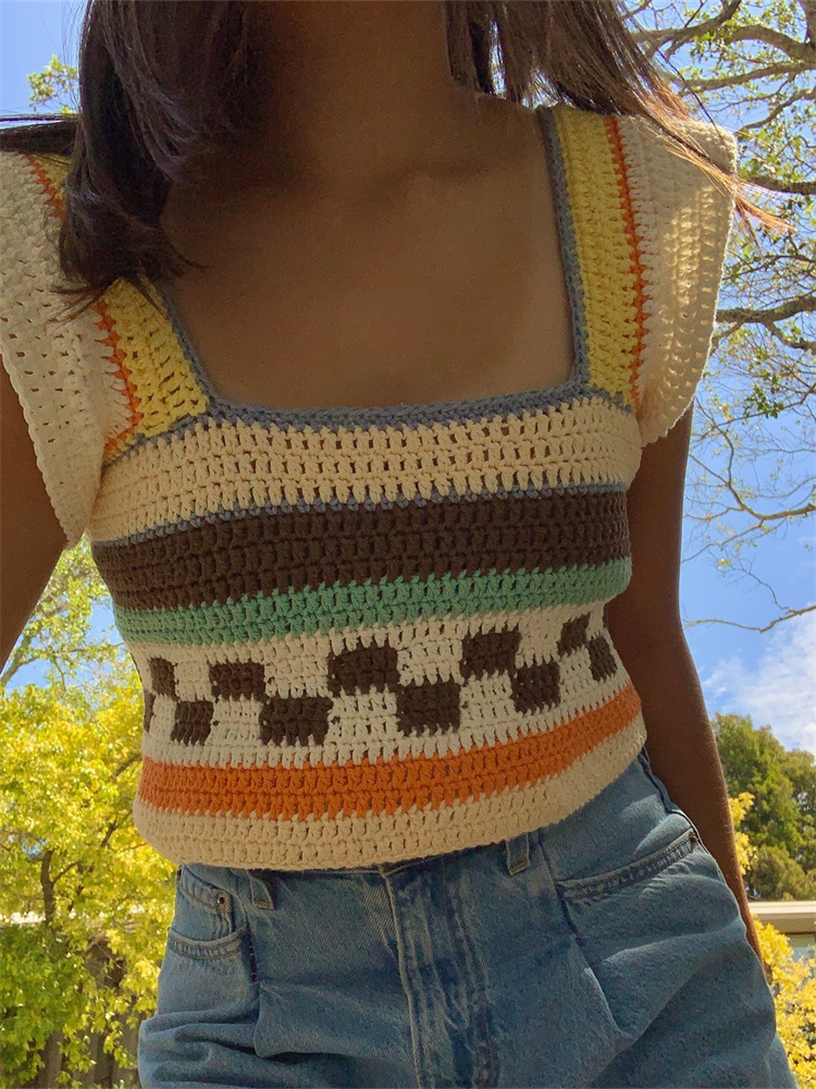Винтажный вязаный жилет Y2K Летний Полосатый лоскутный квадратный воротник оборки короткий рукав майка эстетический кроп Топы Одежда
